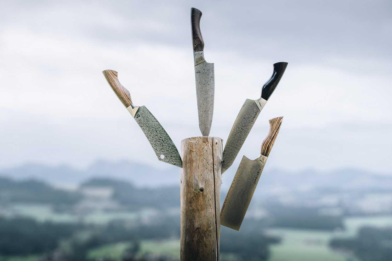 Alle unsere Messer und Beile werden aus vielen Lagen Damaststahl mit einem Spezialstahlkern gefertigt. Die edlen, markanten und individuellen Maserungen entstehen durch die kunstvolle Technik des Stahlfaltens. Durch zusätzliche Oberflächenbehandlungen und eine sorgfältige Handpolitur werden die einzigartigen Muster der Klingen besonders betont. Abgerundet werden unsere Produkte durch unsere charakteristischen, exotischen Holzgriffe, die jedes Messer zu einem echten Unikat machen.